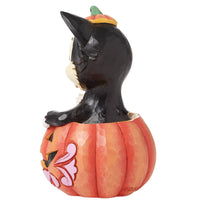 In this enchanting Jim Shore design, Figaro, the beloved tuxedo cat from Disney's Pinocchio, peeks out from inside a carved jack-o'-lantern adorned with the artist's iconic rosemaling. With a playful wave, Figaro brings feline charm to Halloween.