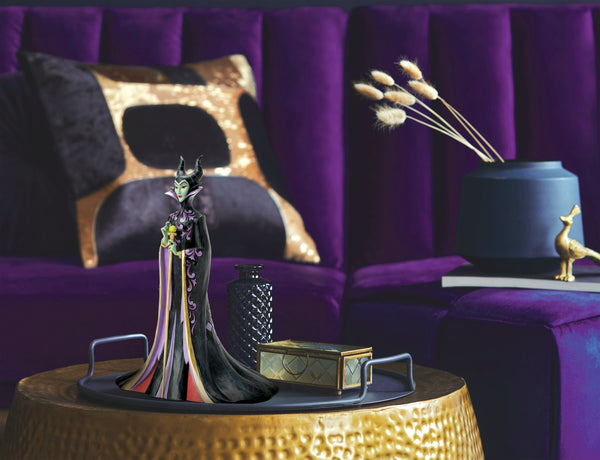 This Jim Shore design captures the vengeful villainess, Maleficent, in her striking black and purple cloak adorned with Shore's quilt and rosemaling patterns. With a sinister gaze, she taps her staff, channeling dark magic with malice in her heart.